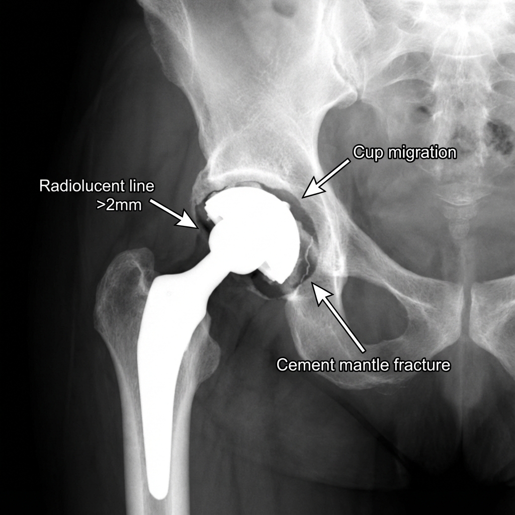 Source: AI-Generated: Cemented THA Acetabular Loosening Educational Radiograph • OrthoVellum AI • OrthoVellum Educational Use
