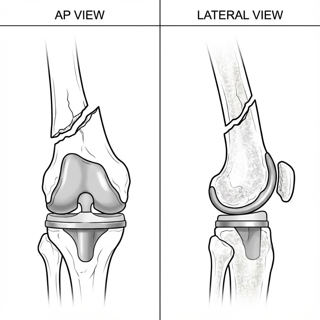 AP and lateral radiographs showing displaced supracondylar femur fracture above total knee arthroplasty. TKA components appear well-fixed without radiolucent lines. Fracture is displaced with varus angulation. Osteoporotic bone quality evident.