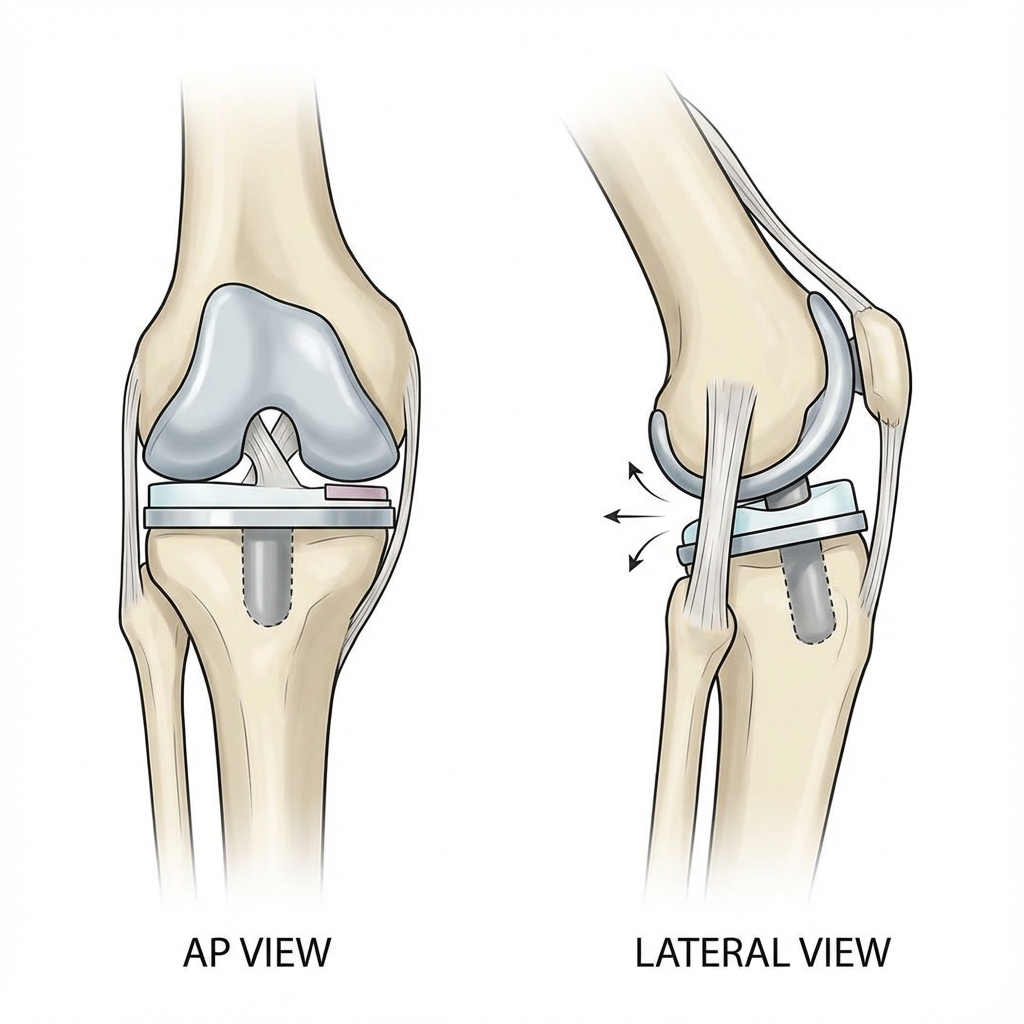 AP and lateral radiographs of TKA showing valgus alignment with lateral tibial translation. Assess component position, alignment, polyethylene thickness, and cam-post engagement on lateral view.