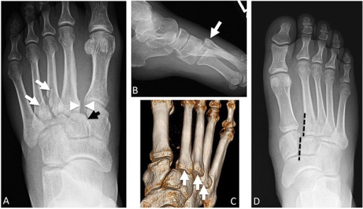 Weight-bearing AP radiograph of the foot demonstrating a Lisfranc injury. There is loss of alignment between the medial border of the 2nd metatarsal and the medial border of the middle cuneiform (disrupted 2nd TMT joint). There is widening between the 1st and 2nd metatarsal bases (>2mm). A fleck sign is visible at the base of the 2nd metatarsal representing an avulsion of the Lisfranc ligament.