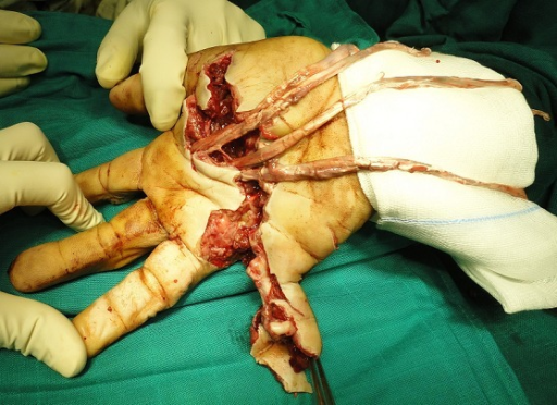 Clinical photograph demonstrating examination of flexor tendon function. The ring finger is held in extension at rest (cascade disrupted). Testing FDP: holding middle phalanx, patient cannot flex DIP. Testing FDS: holding adjacent fingers extended, patient cannot flex PIP. This demonstrates complete laceration of both FDP and FDS tendons in Zone II (no man's land). Urgent surgical repair is required.