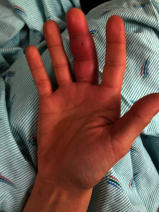 Clinical photographs demonstrating infectious flexor tenosynovitis of the middle finger. All four Kanavel signs are present: (1) fusiform swelling of the finger, (2) finger held in flexion, (3) tenderness along the flexor sheath, and (4) pain on passive extension. This represents a surgical emergency requiring urgent sheath irrigation to prevent tendon necrosis and loss of finger function.
