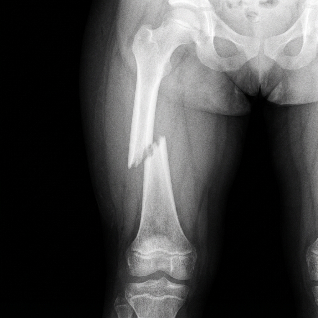 AP and lateral radiographs of the left femur in a 6-year-old child showing a transverse midshaft femoral fracture. There is approximately 1.5cm of overlap (shortening) and acceptable alignment. The fracture pattern is consistent with low-energy trauma. The physis is open. This fracture is suitable for flexible intramedullary nail (TENS) fixation given the child's age and fracture characteristics.