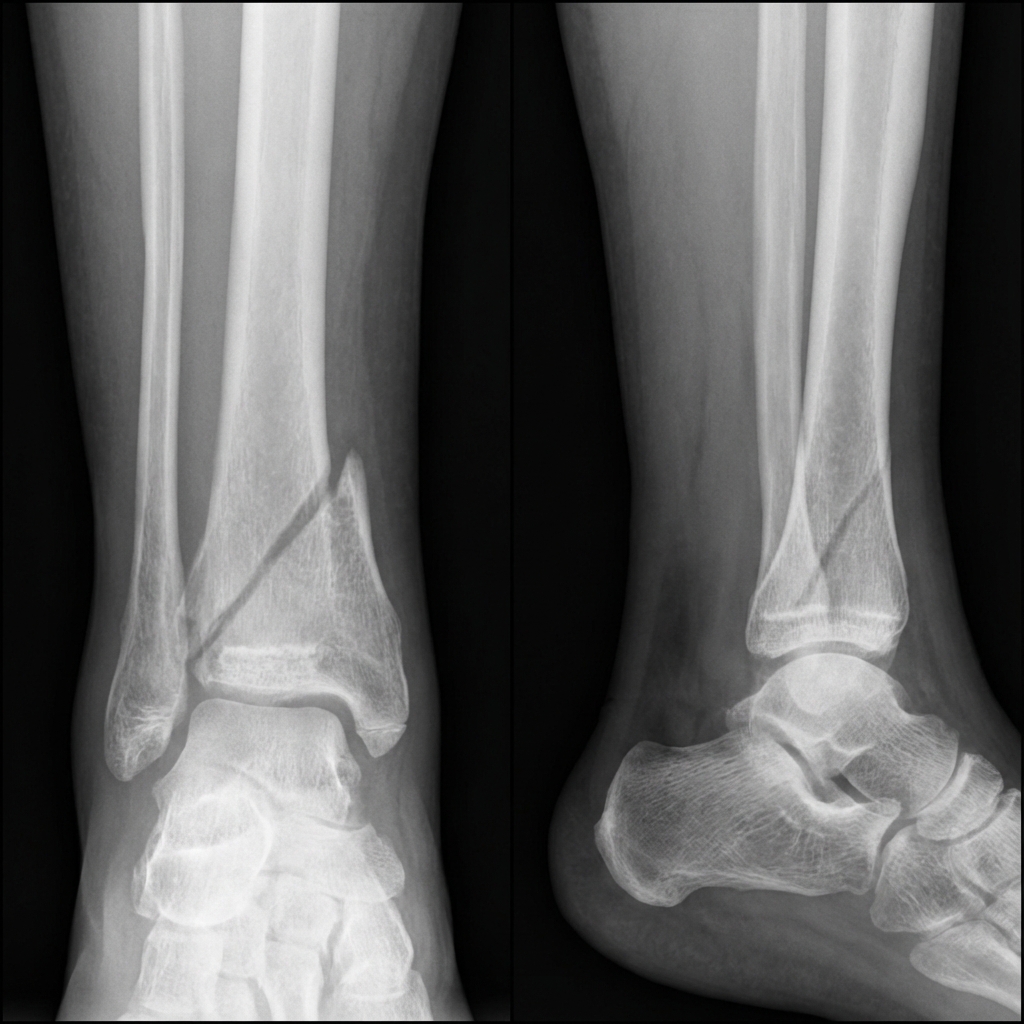 AP and lateral ankle radiographs in a 12-year-old child demonstrating a Salter-Harris Type II fracture of the distal tibia. The fracture line extends through the physis (S = separation) and exits through the metaphysis (A = above). A Thurston-Holland fragment is visible on the lateral side. The fibula is intact. The distal tibial physis is widened medially. This injury pattern is at risk for premature physeal closure.