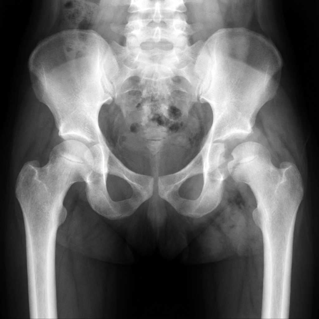 AP pelvis radiograph of a 2-year-old child demonstrating left hip septic arthritis. The left hip joint space is widened compared to the right. There is lateral subluxation of the femoral head with disruption of Shenton's line. Soft tissue swelling is visible around the hip. No bony changes yet (early presentation). The constellation of findings suggests septic arthritis with effusion requiring urgent intervention.