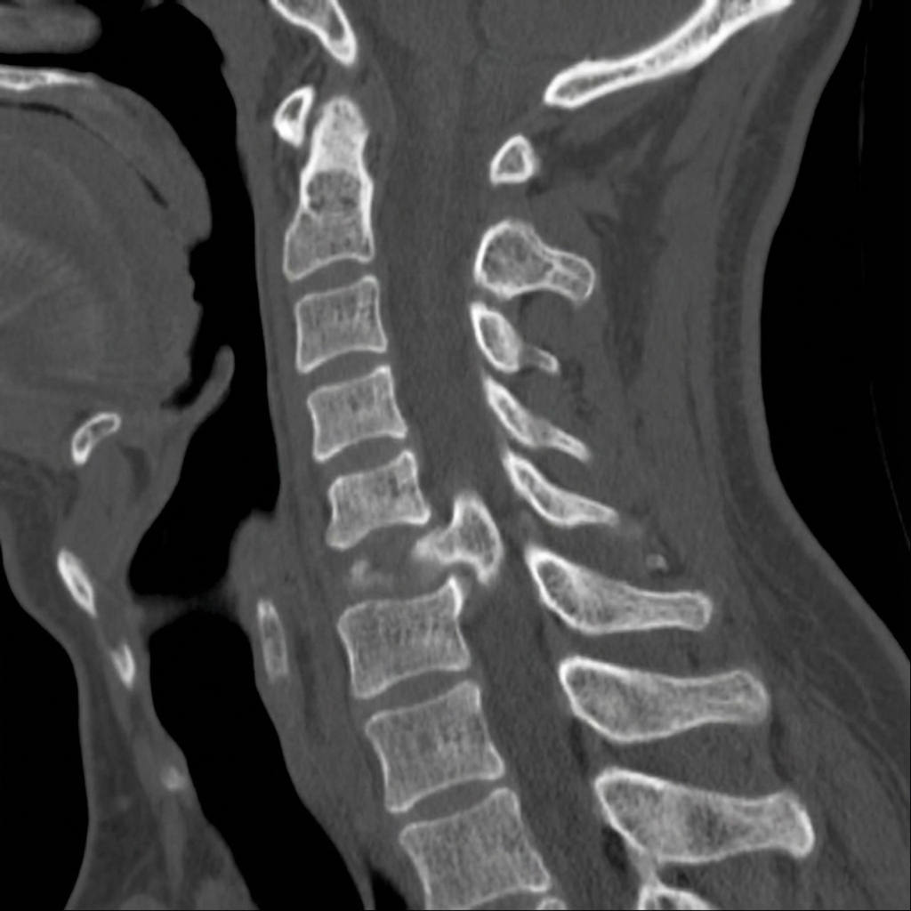 Sagittal and axial CT images demonstrating unilateral left facet dislocation at C6-7. The left C6 inferior articular process is locked anterior to the C7 superior articular process (jumped facet). There is approximately 25% anterior translation of C6 on C7 with rotation. The right facet is subluxed but not locked. This represents unilateral facet dislocation with associated radiculopathy pattern.