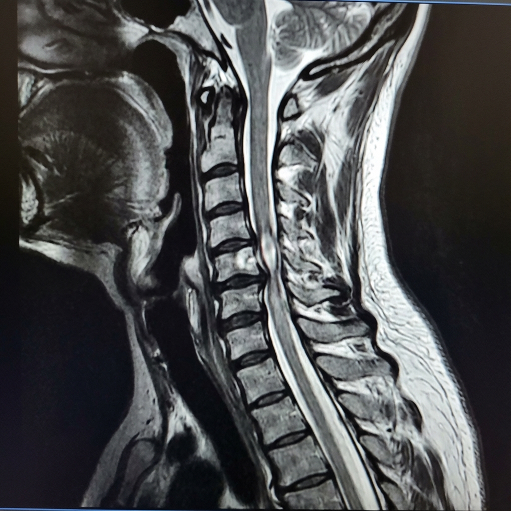 Sagittal T2-weighted MRI demonstrating multi-level cervical stenosis at C3-4, C4-5, and C5-6. There is cord compression with intramedullary T2 hyperintensity at C4-5 level indicating myelomalacia. The cord appears flattened and draped over disc-osteophyte complexes. Ligamentum flavum hypertrophy contributes posteriorly. This represents degenerative cervical myelopathy (DCM) requiring surgical decompression.