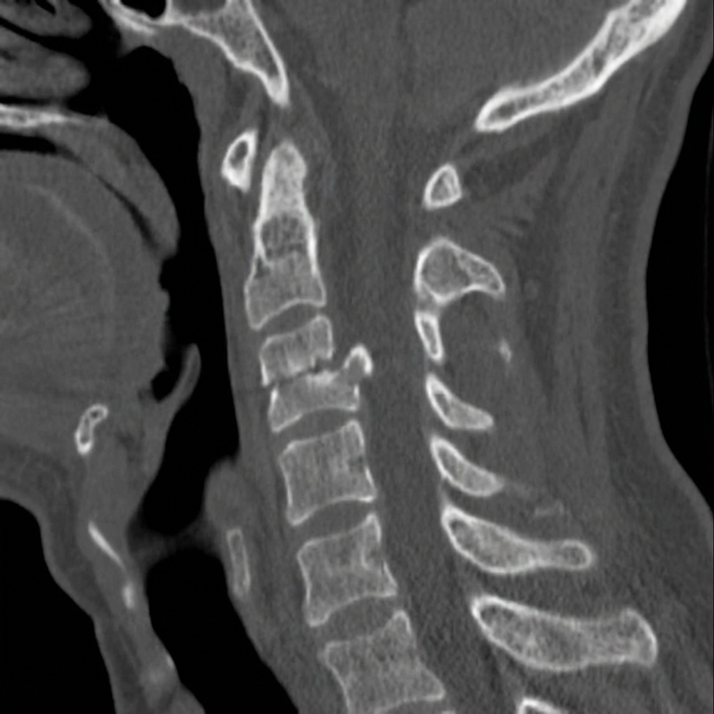 Sagittal and coronal CT images demonstrating Type II odontoid fracture at the base of the dens with 4mm posterior displacement of the dens relative to the C2 body. The fracture line is at the junction of the odontoid process and C2 body - the watershed zone for blood supply. This represents a Type II odontoid fracture in an elderly patient with high non-union risk requiring surgical stabilization.