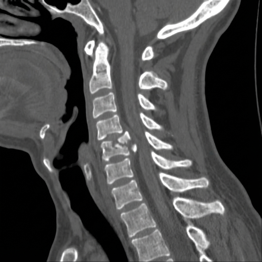 Sagittal and axial CT images demonstrating a C5 burst fracture with loss of vertebral body height, retropulsed posterior wall fragment causing canal compromise of approximately 50%. The posterior ligamentous complex appears intact on CT. MRI shows cord compression with edema. This represents a subaxial cervical injury requiring SLIC scoring for treatment decision.
