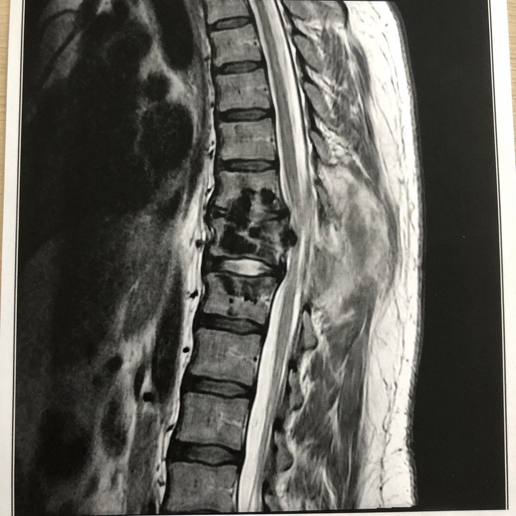 Sagittal and axial T2-weighted MRI demonstrating destruction of T10 and T11 vertebral bodies with relative preservation of the disc spaces (characteristic). Large paravertebral abscess extends anterolaterally. There is gibbus kyphotic deformity and spinal cord compression. This represents spinal tuberculosis (Pott's disease) requiring antitubercular chemotherapy and surgical consideration.