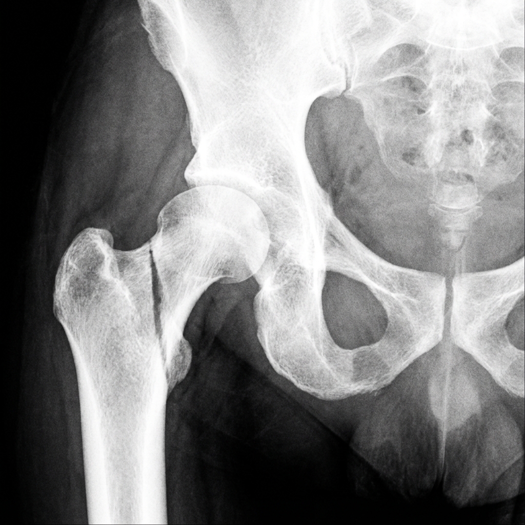 AP pelvis radiograph demonstrating displaced subcapital femoral neck fracture (Garden IV) in a young adult. The femoral head is completely displaced with no contact between head and neck fragments. High Pauwels angle (>70°) indicating high shear forces. This is an orthopaedic emergency requiring urgent anatomic reduction and fixation.