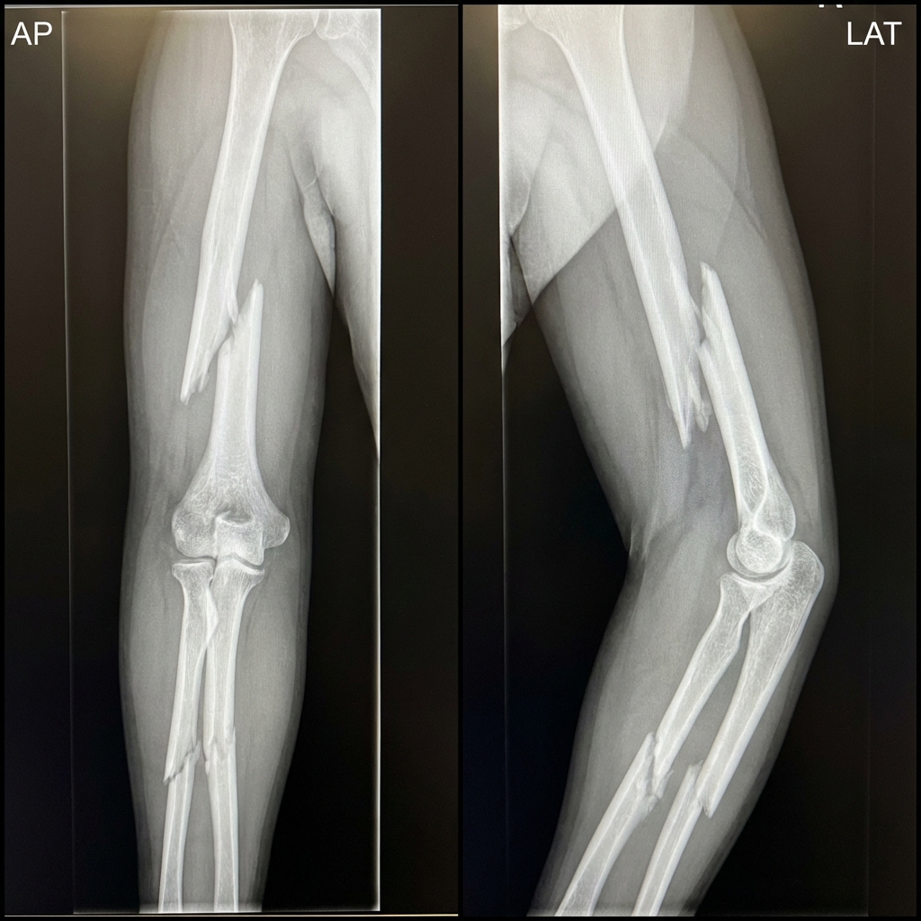 AP and lateral radiographs demonstrating displaced midshaft humerus fracture with spiral pattern and displaced both-bone forearm fracture in the same limb. The elbow joint appears concentrically reduced but without bony continuity to either shoulder or wrist. This is a floating elbow injury - a high-energy pattern with significant complication risk.