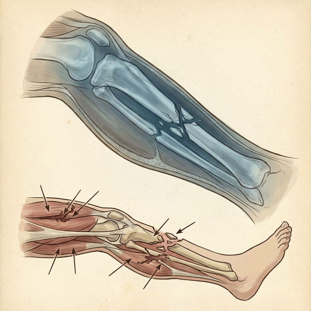 Clinical photographs demonstrating severe lower limb injury with extensive soft tissue destruction, exposed bone and muscle, contamination from farm machinery. AP and lateral radiographs showing comminuted tibial shaft fracture with significant bone loss. Clinical signs of vascular compromise with absent distal pulses. This represents a limb-threatening injury requiring multidisciplinary assessment.