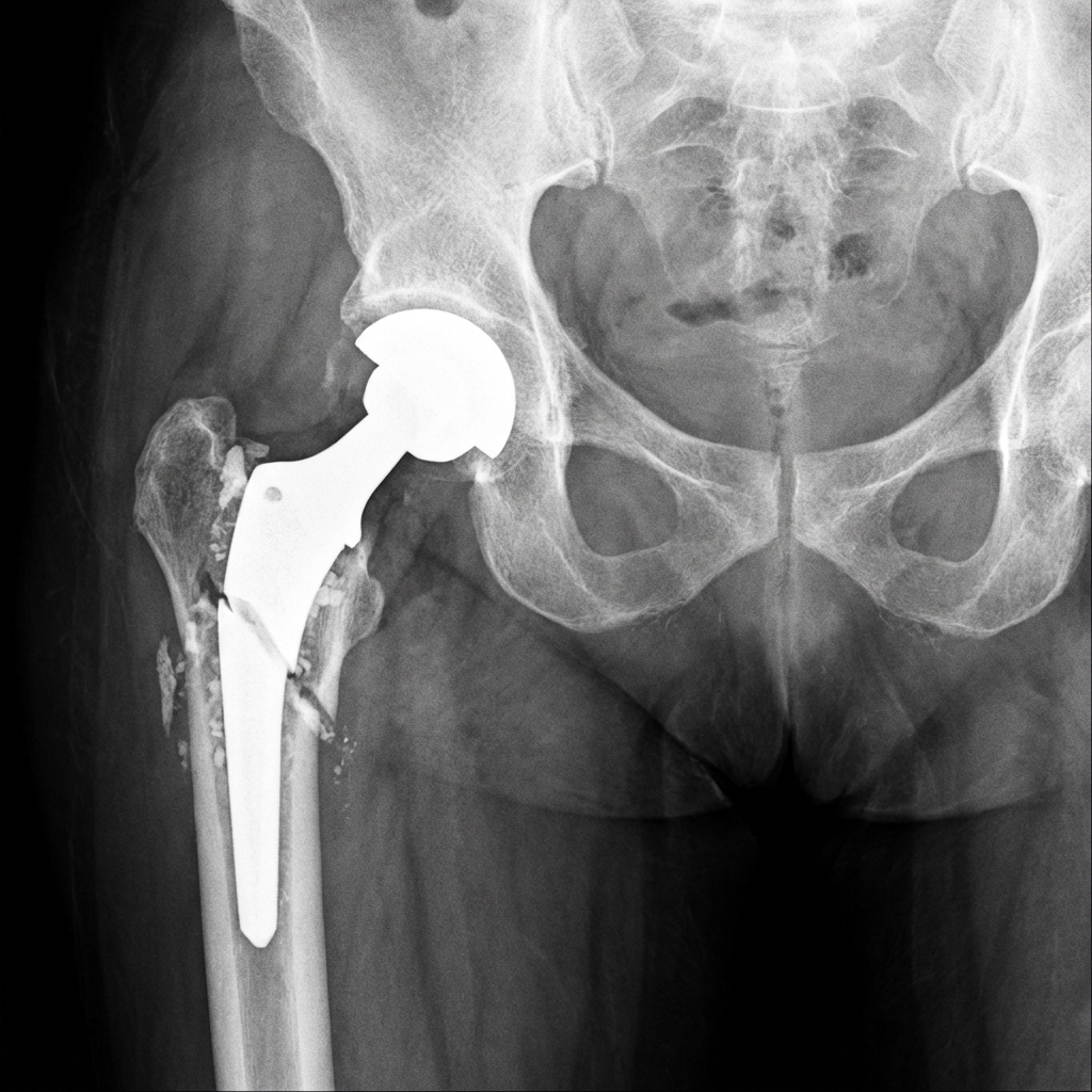 AP pelvis radiograph demonstrating periprosthetic femur fracture around a cemented total hip arthroplasty. The fracture is at the level of the stem tip with oblique pattern extending proximally. Evidence of cement mantle fracture and possible stem subsidence. The patient had pre-injury pain suggesting loosening. This is a Vancouver B2 pattern requiring revision arthroplasty.