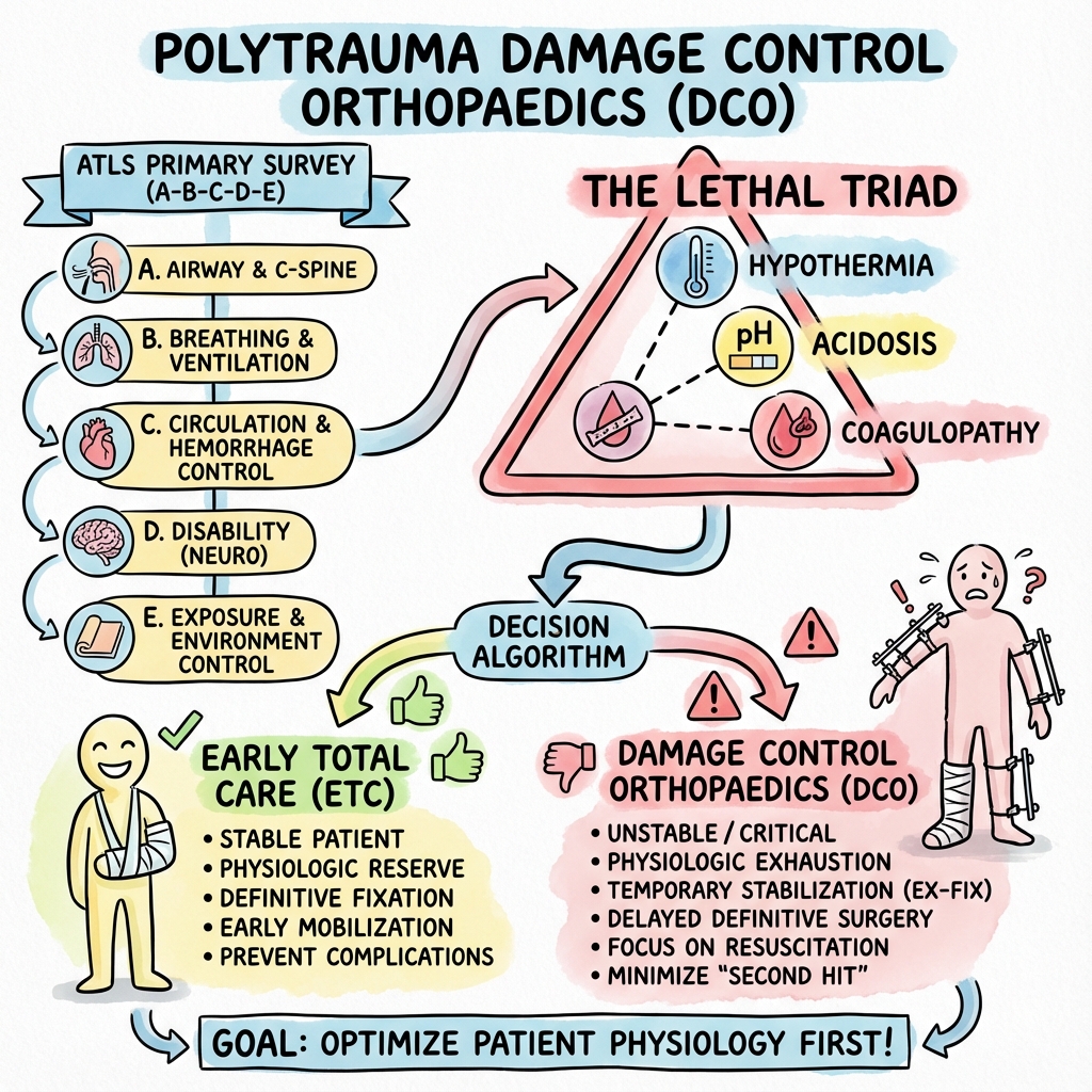 Diagram showing ATLS primary survey approach (A-B-C-D-E) with decision algorithm for Damage Control Orthopaedics versus Early Total Care based on physiological parameters (lethal triad: hypothermia, acidosis, coagulopathy).