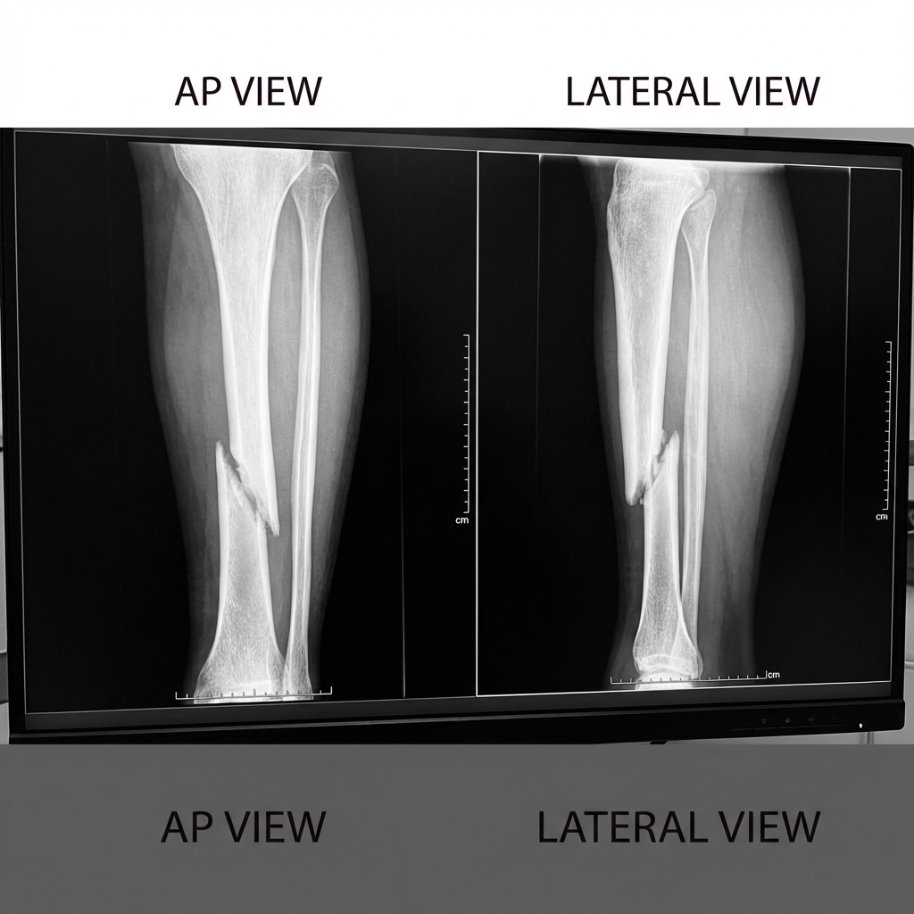 AP and lateral radiographs demonstrating displaced spiral fracture of the tibial shaft at the junction of middle and distal thirds with intact fibula. Approximately 1cm shortening with minimal angulation. The spiral pattern suggests a rotational mechanism with relatively low energy.