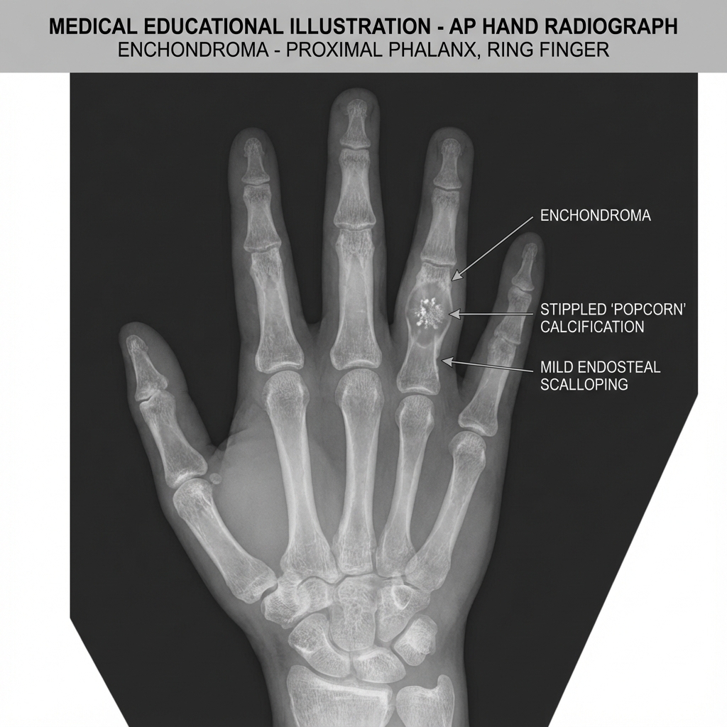 Source: AI-Generated Educational Illustration: Enchondroma in Proximal Phalanx • OrthoVellum Educational Use