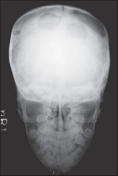 Lateral skull radiograph demonstrating a solitary 'punched-out' lytic lesion in the parietal bone characteristic of Langerhans cell histiocytosis (eosinophilic granuloma). The lesion has sharp, well-defined margins with a 'beveled edge' (inner table destroyed more than outer). There is no sclerotic rim or periosteal reaction. This appearance in a child is virtually pathognomonic for LCH.