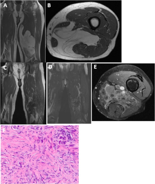 Axial T2-weighted MRI of the left thigh showing a large, heterogeneous soft tissue mass in the anterior compartment. The mass is well-circumscribed with high T2 signal and areas of necrosis. It displaces the femoral vessels but does not encase them. The size (>5cm), depth (deep to fascia), and heterogeneous appearance are concerning for high-grade sarcoma. Biopsy is required before treatment.